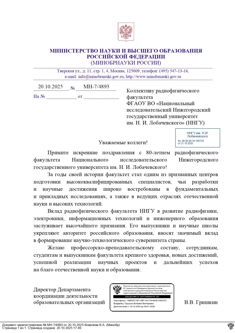 Минобрнауки России поздравляет коллектив радиофизического факультета с 80-летием